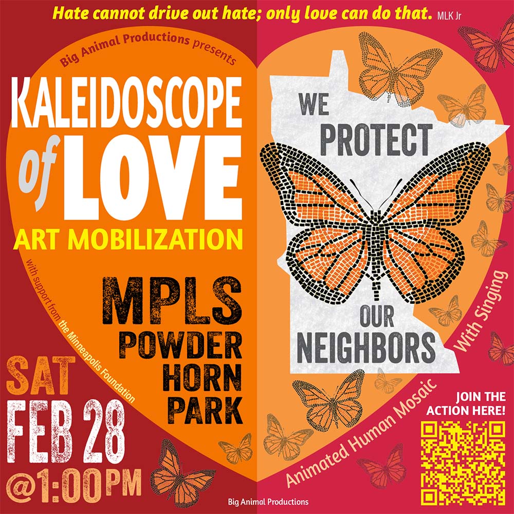 Imagine the choreographed movement of more than 1000 people holding colored placards to the sky to create the transforming shape of a butterfly, surrounded by poetry and choral singing. On Saturday, February 28th at 1pm in Powderhorn Park, a message of solidarity and compassion will culminate with a massive art action called “Kaleidoscope of Love” celebrating neighborhood resilience and shared democratic freedoms.