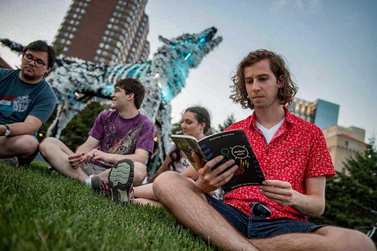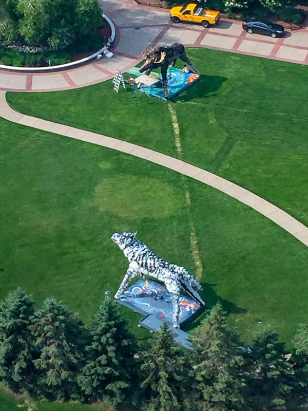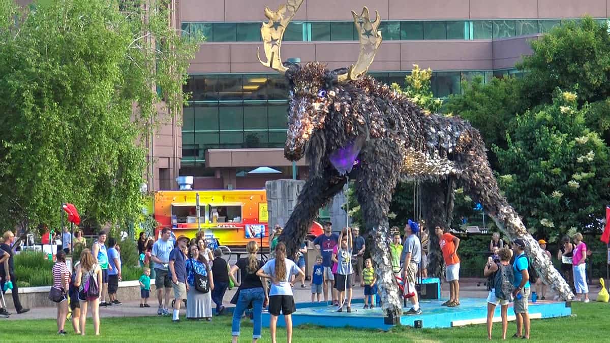 Christopher created the Wolf and Moose to reflect the unique qualities and ethos of the Minneapolis community, while inspiring thinking outside the urban box. The sculptures engage people in contemplating our connection to animals and how we depend upon them for our very existence. The pieces are built around a three-point ecological framework that celebrates our community’s conscious effort and accomplishments around development of renewable energy, expansion of more sustainable transportation and a responsibility towards reducing our consumption and waste of raw materials.The pieces are made of 90% waste-stream materials, including over 7,000 recycled plastic bottles, 320 yards of reclaimed window screening and hundreds of feet of CATV coaxial cable end-runs.