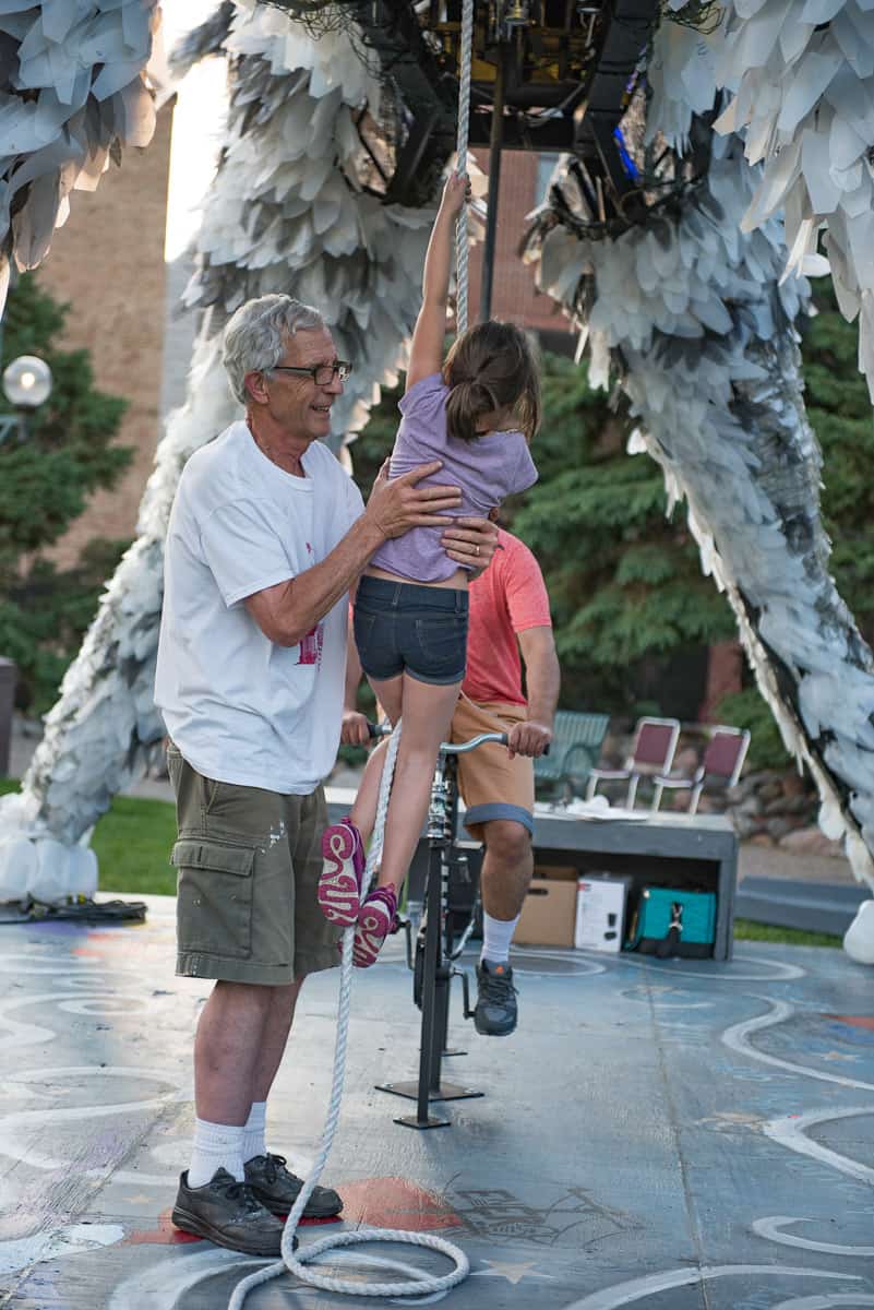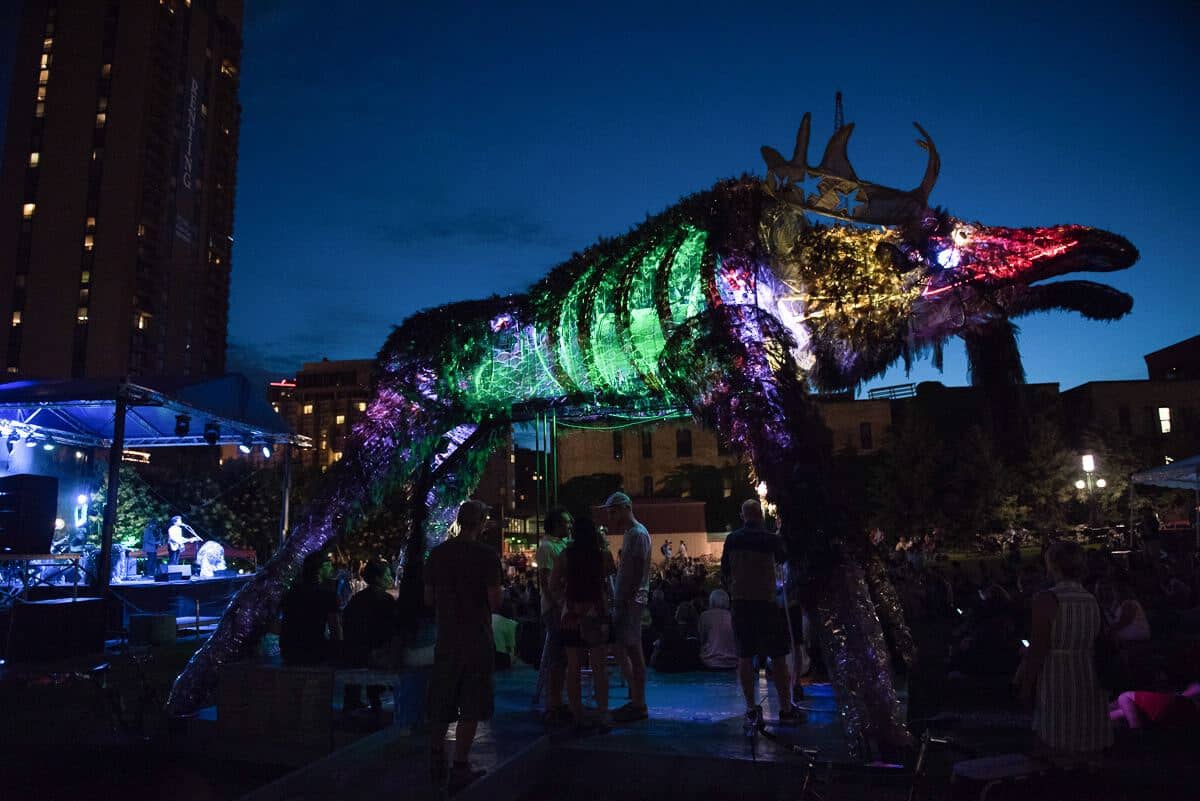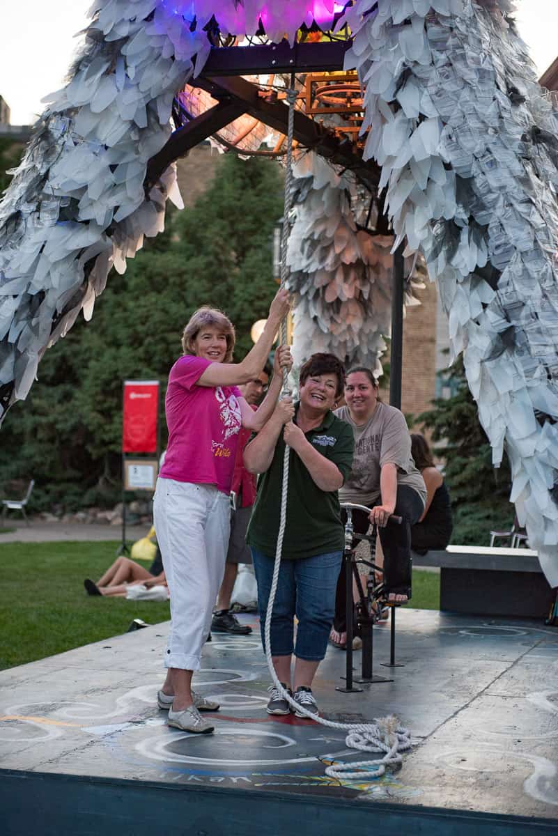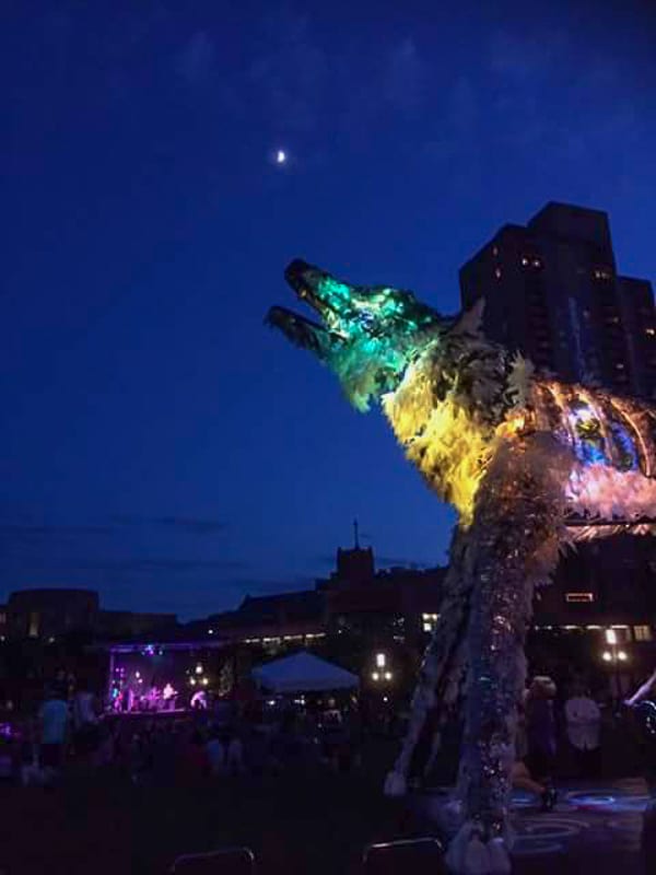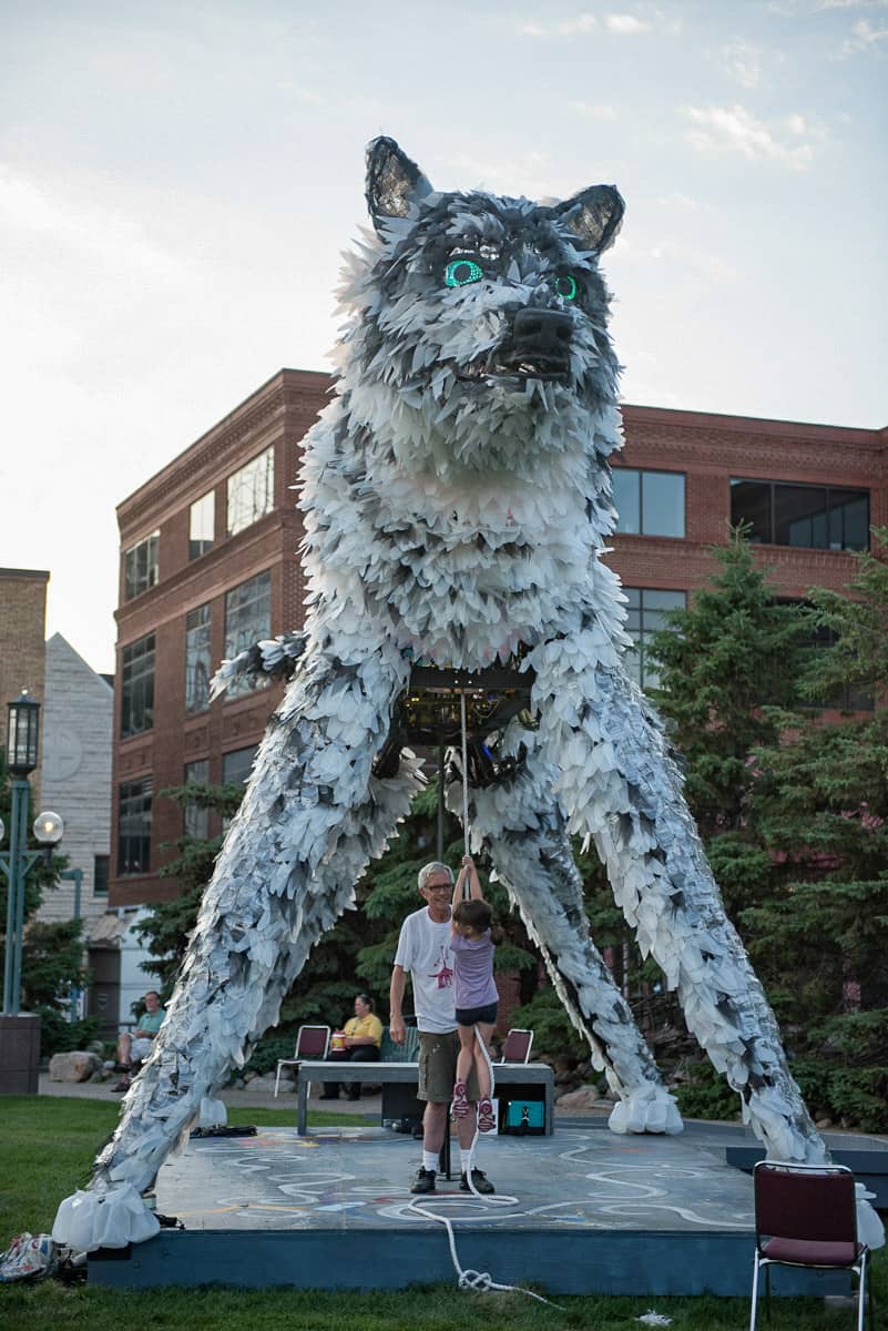 Wolf and Moose, originally commissioned by the City one Minneapolis, are interactive, animated and illuminated sculptures of a wolf and a moose. Like giant mechanical toys, interior animations can be activated by participants pedaling a stationary bike mounted under each of the figures, rotating an Earth globe nested in the thorax of the Wolf and beating a steel drum heartbeat in the chest of the Moose. Participants can also pull a rope, to make the Wolf howl and the Moose bellow. The pedaling action also actuates an audio repeater to play spoken word poetry by Ojibwa author Heid Erdrich, couched in the soundscape of Trevino Brings-Plenty.