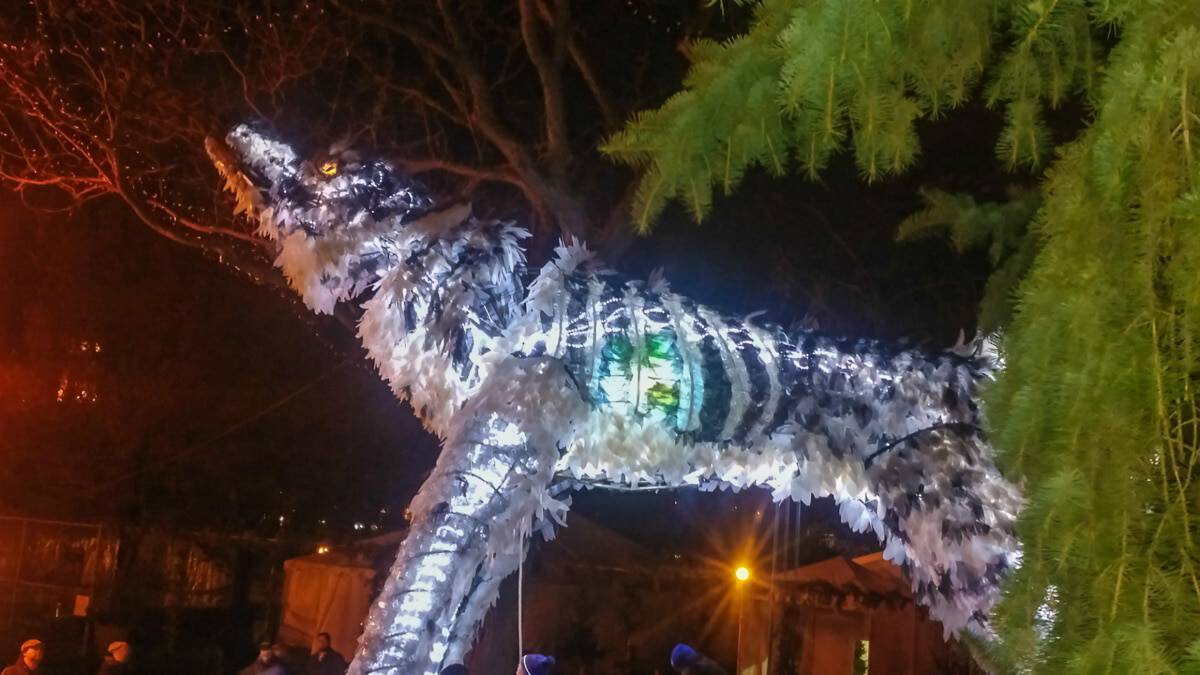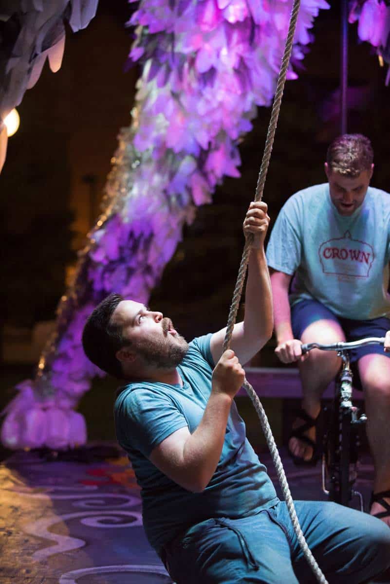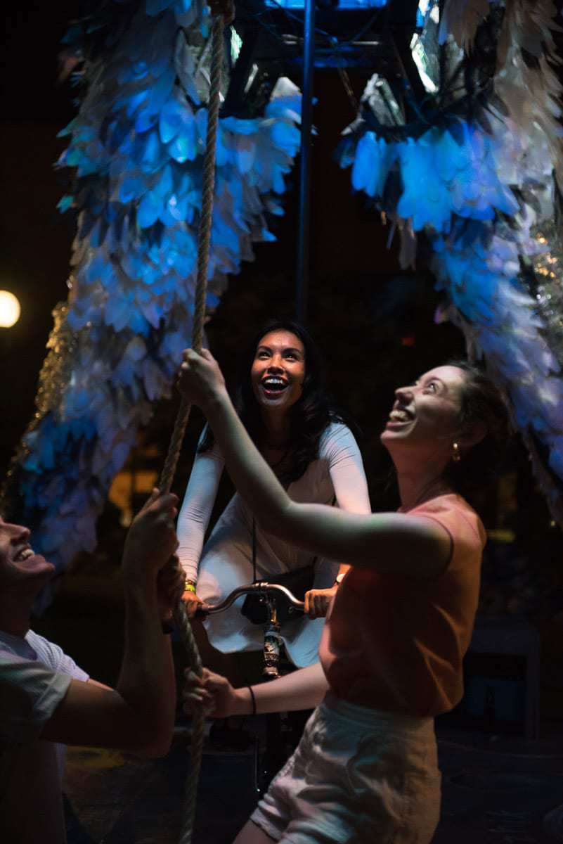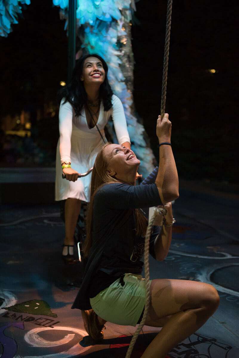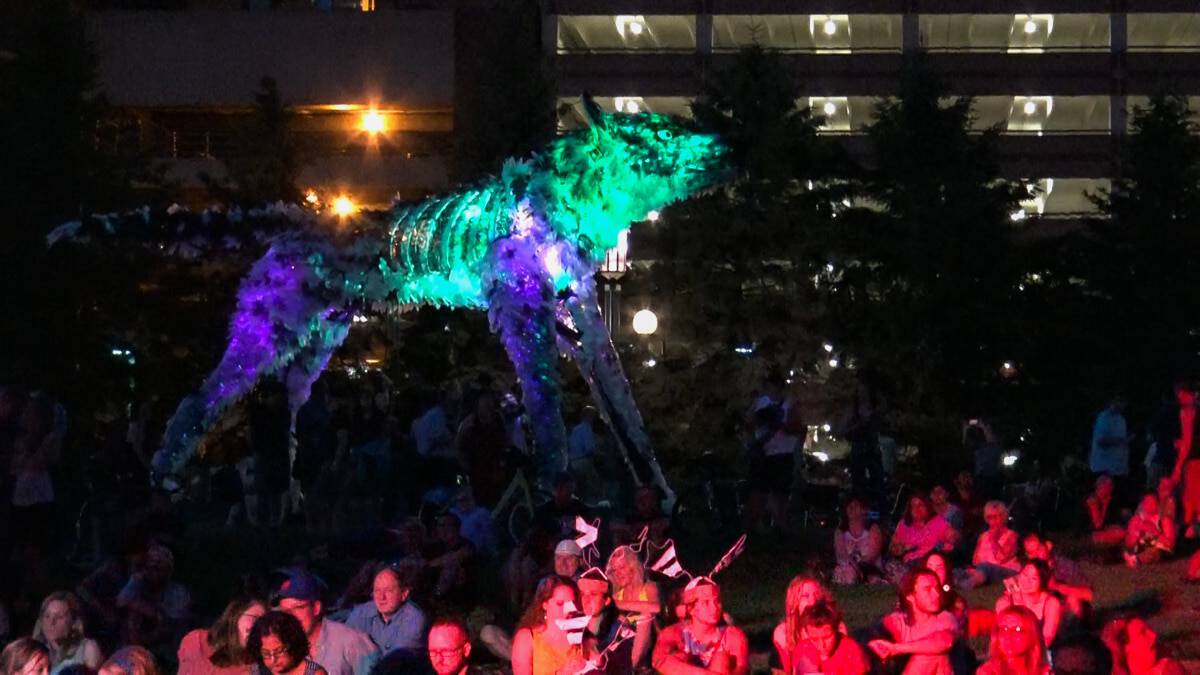 Wolf and Moose, originally commissioned by the City one Minneapolis, are interactive, animated and illuminated sculptures of a wolf and a moose. Like giant mechanical toys, interior animations can be activated by participants pedaling a stationary bike mounted under each of the figures, rotating an Earth globe nested in the thorax of the Wolf and beating a steel drum heartbeat in the chest of the Moose. Participants can also pull a rope, to make the Wolf howl and the Moose bellow. The pedaling action also actuates an audio repeater to play spoken word poetry by Ojibwa author Heid Erdrich, couched in the soundscape of Trevino Brings-Plenty.
